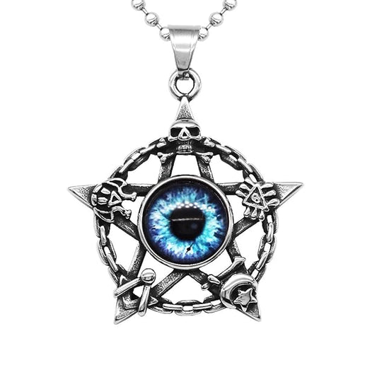 Men Stainless Steel Pentacle Star Evil Eye Skull Pendant Necklace Blue Eye
